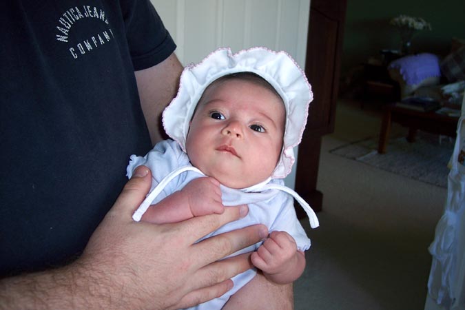 June 16: What the heck am I doing in this baby bonnet?Take it off: you're crimping my style!